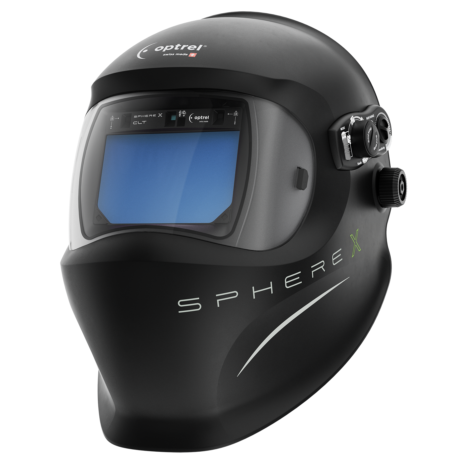 sphere X clt black – welding helmet with variable shade 2/5-12 and ShadeTronic® function, manual mode, CLT (Crystal Lens Technology), opening delay with FadeTronic function, true colour view, sensitivity adjustment, grind function and IsoFit® X headgear